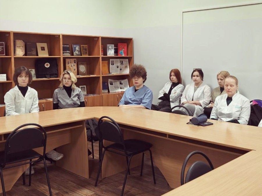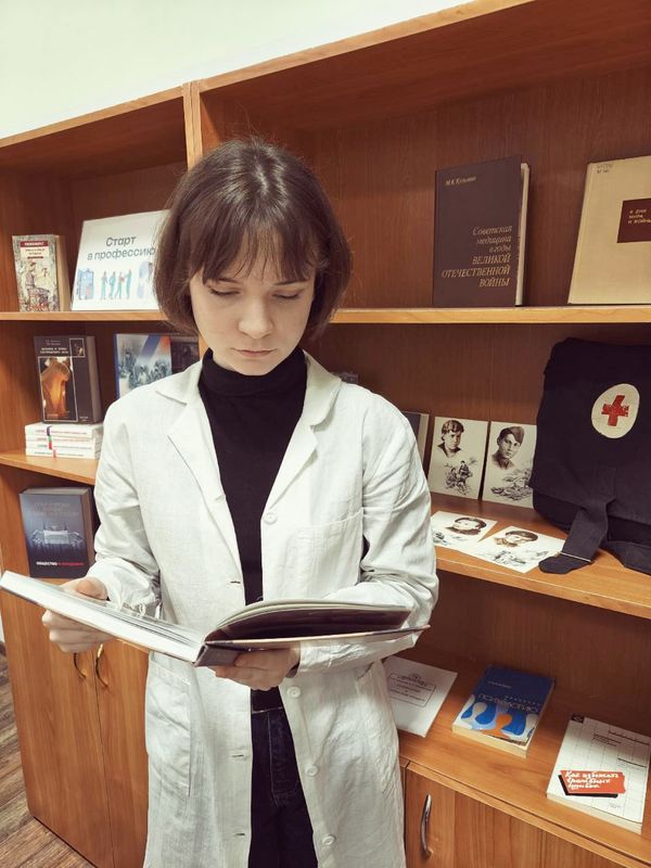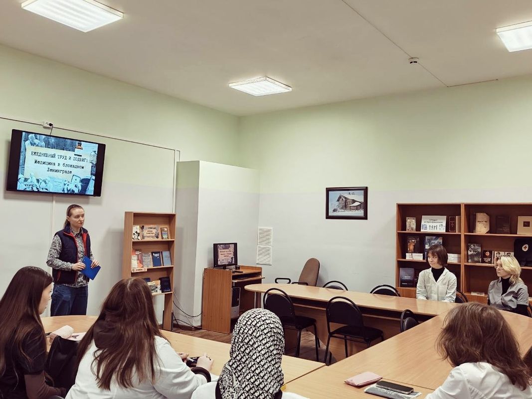 Классные часы на тему "Ежедневный труд и подвиг: медицина в блокадном Ленинграде" в группах 118с "Лечебное дело" (куратор Е. В. Григорьева), 151о "Сестринское дело" (куратор А. Ю. Полоселов) и 171с "Стоматологическое дело" (куратор С. А. Яковчук) провела педагог-библиотекарь Анна Александровна Ларионова.
