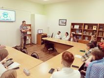 На встрече с писателем присутствовали студенты 171 группы специальности "Стоматологическое дело" (куратор Светлана Анатольевна Яковчук). Олег Кожин познакомился с аудиторией, рассказал о своем творчестве и жанре хоррора как таковом, ответил на вопросы студентов.
