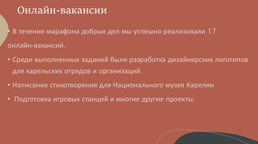 "Марафон добрых дел" дает возможность попробовать себя в качестве волонтера и оказать реальную помощь различным организациям и учреждениям Карелии. В этом году "Марафон добрых дел" проводится Центром развития добровольчества Карелии при поддержке Фонда Грантов Главы Карелии, а также Федерального агентства по делам молодежи "Росмолодежь" и проекта "Добро на старт".