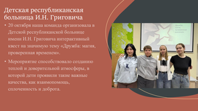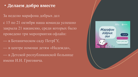 С 15 по 21 октября 2025 года волонтерский отряд Петрозаводского базового медицинского колледжа "Интерны" индивидуально и в составе команды выполнил 22 добровольческих задания, предложенных в виде онлайн-вакансий "Марафона добрых дел".