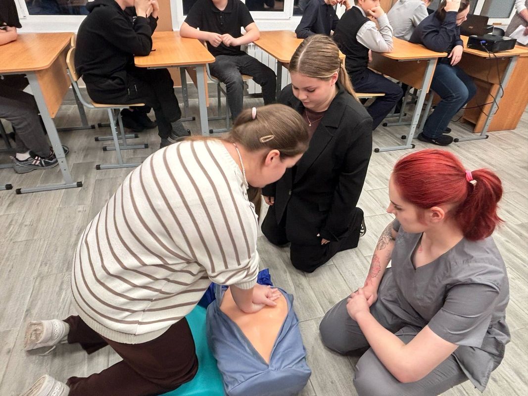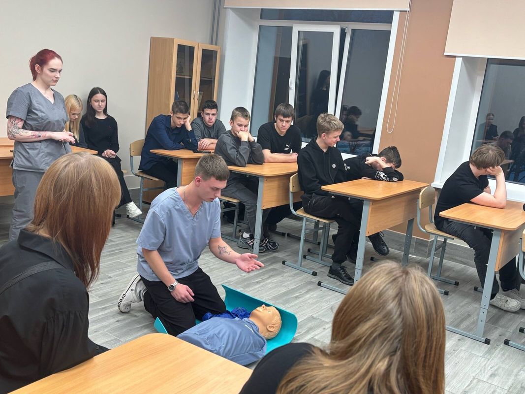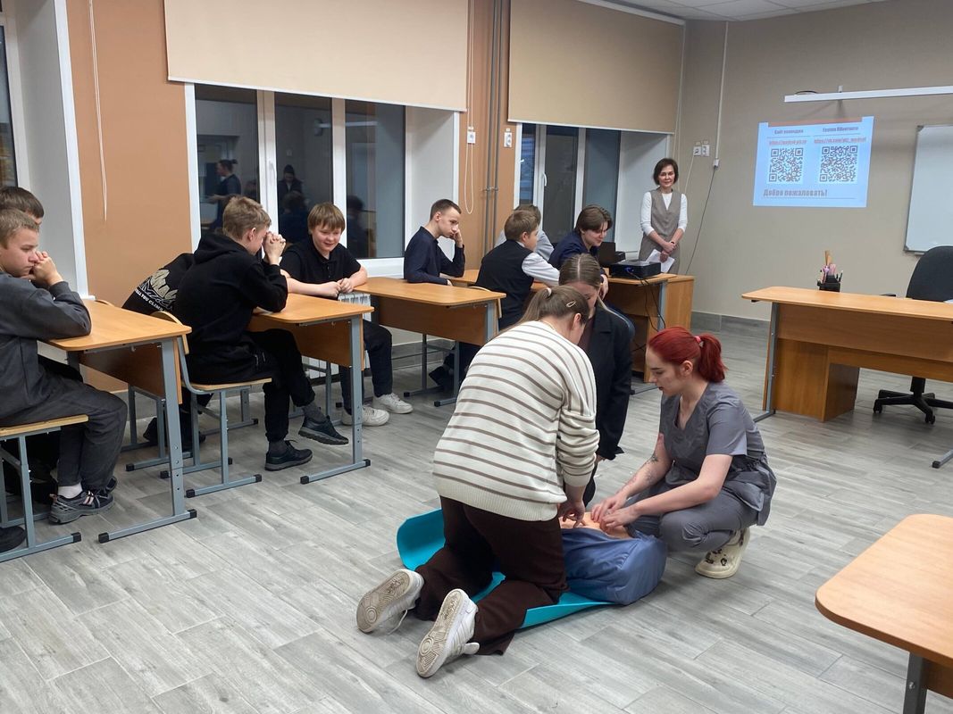 Елена Александровна Мельникова рассказала старшеклассникам о медицинском колледже, условиях поступления и основных специальностях, по которым ведется обучение в колледже. Для школьников также была организована тематическая станция, где с помощью учебных манекенов студенты колледжа продемонстрировали, как выполняется сердечно-легочная реанимация при отсутствии сознания и дыхания у пострадавшего.