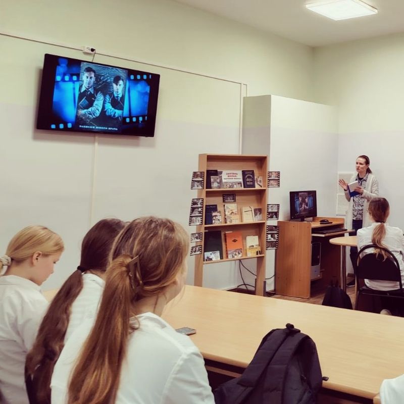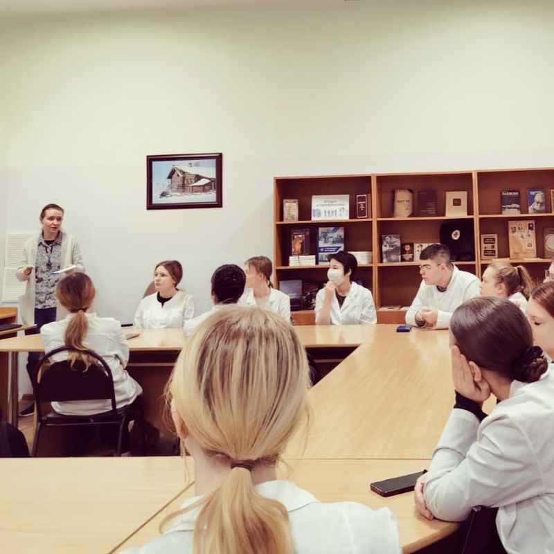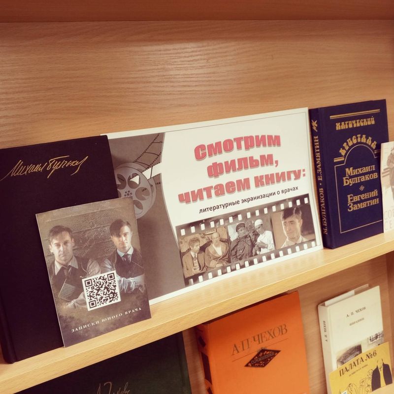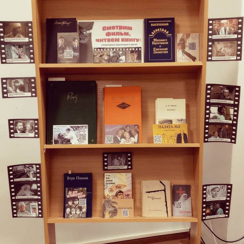 Педагог-библиотекарь Анна Александровна Ларионова провела обзор книжной выставки "Смотрим фильм, читаем книгу: литературные экранизации о врачах", рассказала о знаковых книгах Михаила Булгакова, Антона Чехова, Бориса Полевого, Веры Пановой и Юрия Германа, в которых главными героями являются медики, и познакомила студентов с фрагментами наиболее известных экранизаций литературных произведений.