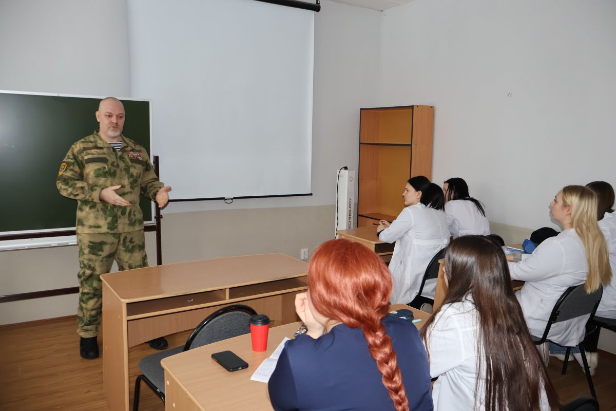 Встреча студентов с ветераном специальной военной операции Александром Пожарским состоялась в группах 312 и 313 специальности "Лечебное дело" в рамках дисциплины "Основы безопасности жизнедеятельности" (преподаватель Андрей Юрьевич Полоселов).