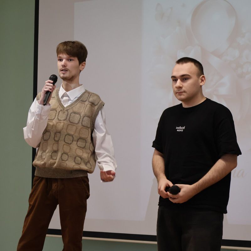 Благодарим 112 группу, студентов 115 группы Евгения Гуторина и Никиту Савельева, а также вдохновителя и ведущего праздничной встречи Алену Викторовну Кувшинову за искренние и жизнерадостные поздравления с Международным женским днем!