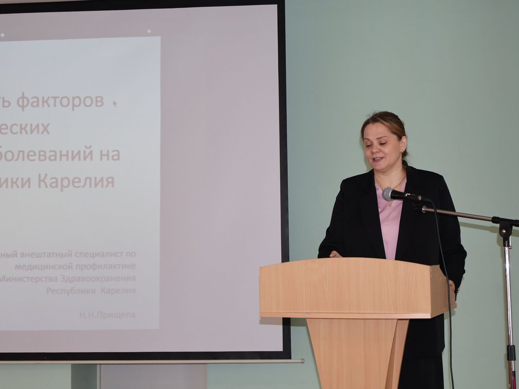 С лекцией на тему "Распространенность факторов риска хронических неинфекционных заболеваний на территории Республики Карелия" выступила главный внештатный специалист по медицинской профилактике Министерства здравоохранения Республики Карелия, руководитель Республиканского центра общественного здоровья и медицинской профилактики, врач-терапевт и ревматолог Наталья Николаевна Прищепа.