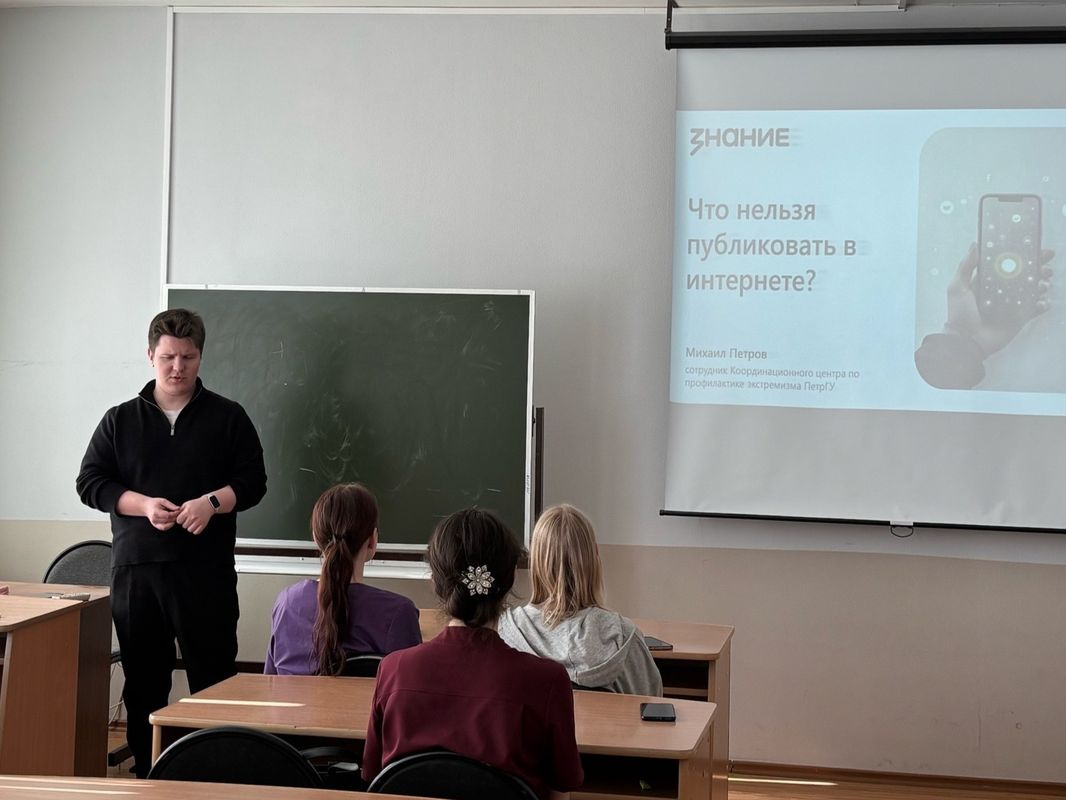 Встречу провел специалист Координационного центра по профилактике экстремизма ПетрГУ Петров Михаил Александрович. Цель встречи - обратить внимание студентов на возможные угрозы в интернете, повысить грамотность в вопросах безопасности и сформировать общепринятые нормы поведения в сети.