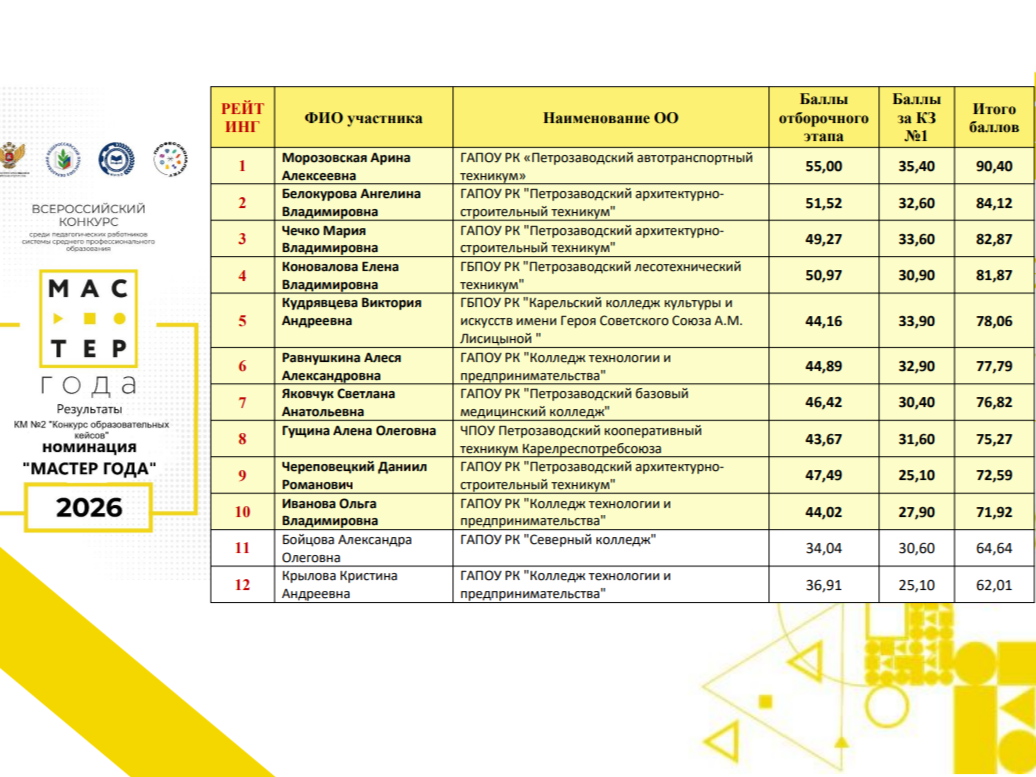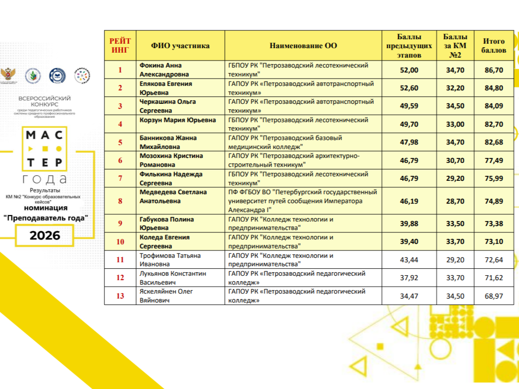Публикуем рейтинг участников конкурса, в следующий этап которого проходят конкурсанты, занимающие первые десять позиций. Конкурсное мероприятие № 3 "Мастер-класс" состоится 16-17 апреля 2026 года. Желаем удачи нашим преподавателям!