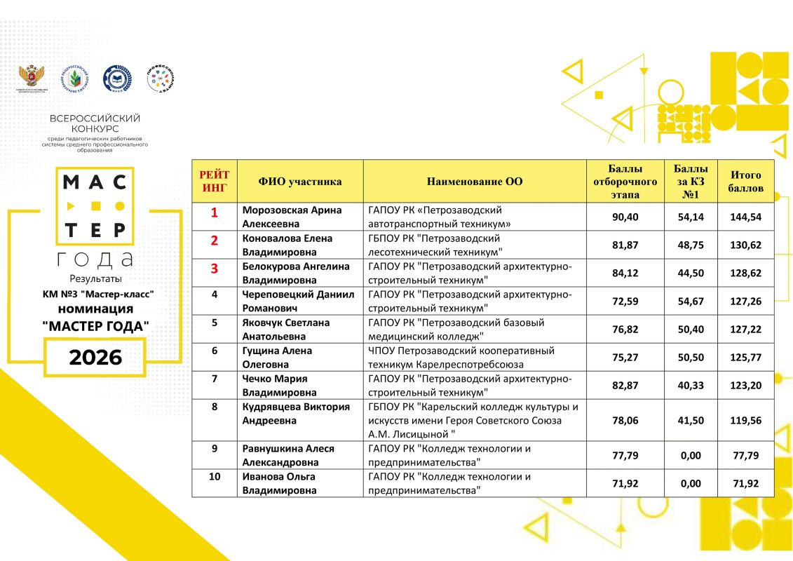 Публикуем рейтинг участников Всероссийского конкурса среди педагогических работников системы среднего профессионального образования "Мастер года", региональным оператором которого является Центр опережающей профессиональной подготовки Республики Карелия.